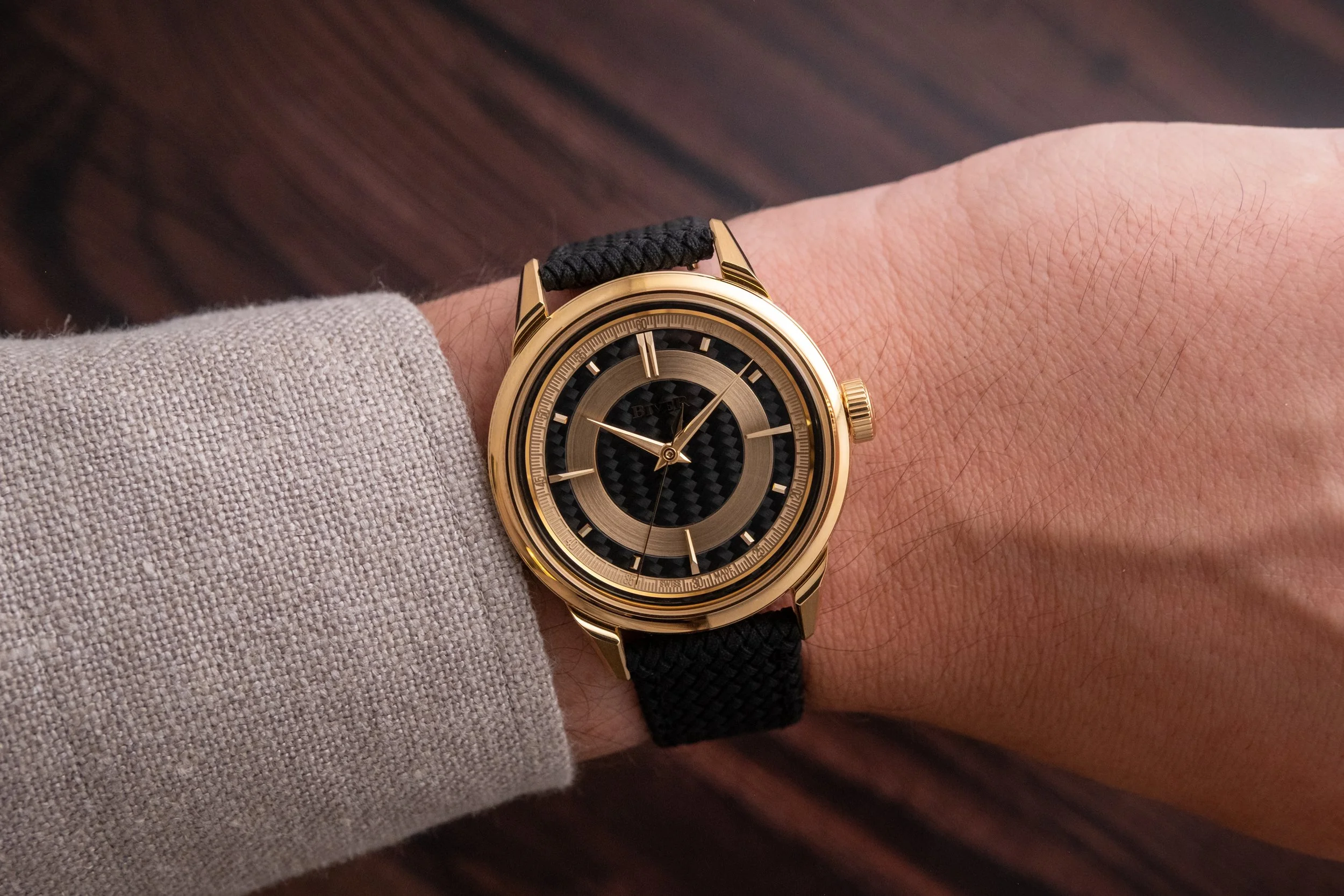 In full yellow gold, the watch feels calm and timeless, the kind of piece that could slip under a cuff now and still look right in 30 years. The Carbon Edition is the opposite: loud, graphic, and designed to be noticed, with the braided rubber strap amplifying that sportier attitude.