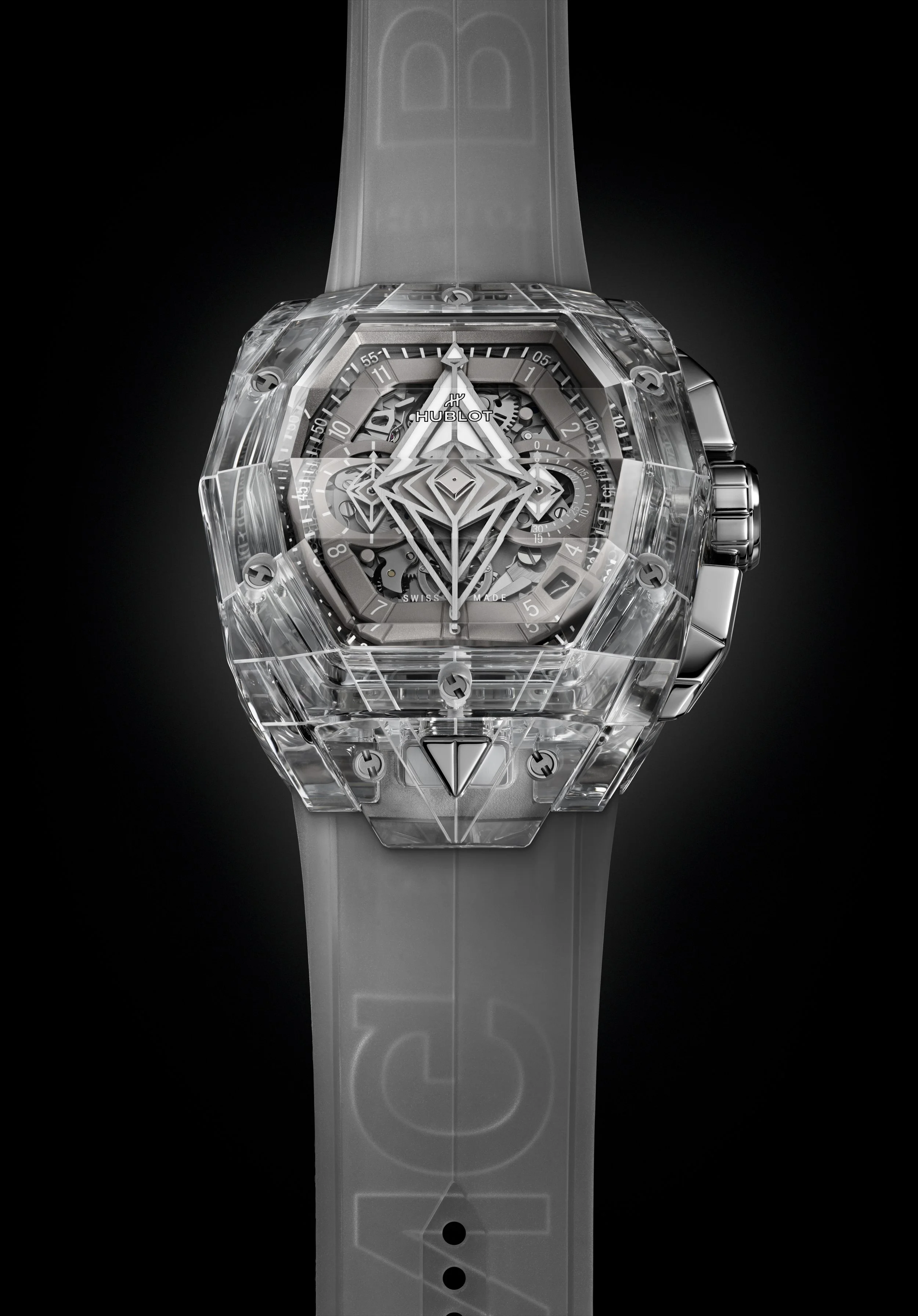 Finding a strap that complements the sapphire case is incredibly hard, but Hublot have absolutely nailed it with this translucent white rubber strap. Equipped with their proprietary click system, you’ll be able to swap the strap out almost instantly, giving the watch a whole new look.