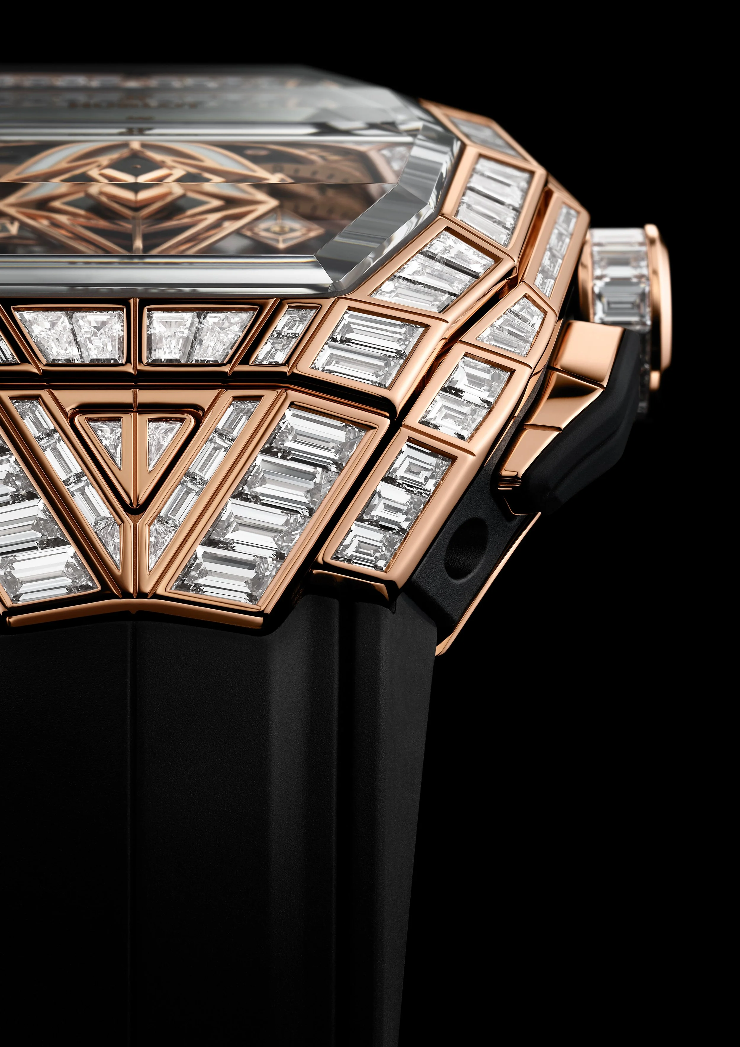 The Spirit of Big Bang’s distinctive barrel-shaped case has been given the ultimate upgrade by Hublot. As previously mentioned, Hublot are the masters of sapphire in the industry, using their cutting-edge technology to make some of the most impressive watches. Sapphire is definitely their most highly regarded material, and for a watch to be given a sapphire case is particularly significant. Maxime Pleschia’s influence can be felt throughout the case with the plethora of sharp edges and facets that construct this iconic barrel shape. Whilst it sits at a rather large 42mm, the case was designed to fit everyone’s wrists, as they don’t want to restrict access to this wonderful work of art. As we all know, sapphire is incredibly hard and scratch-resistant, so there is no risk of damage to the case: Hublot’s sapphire has diamond-like hardness.