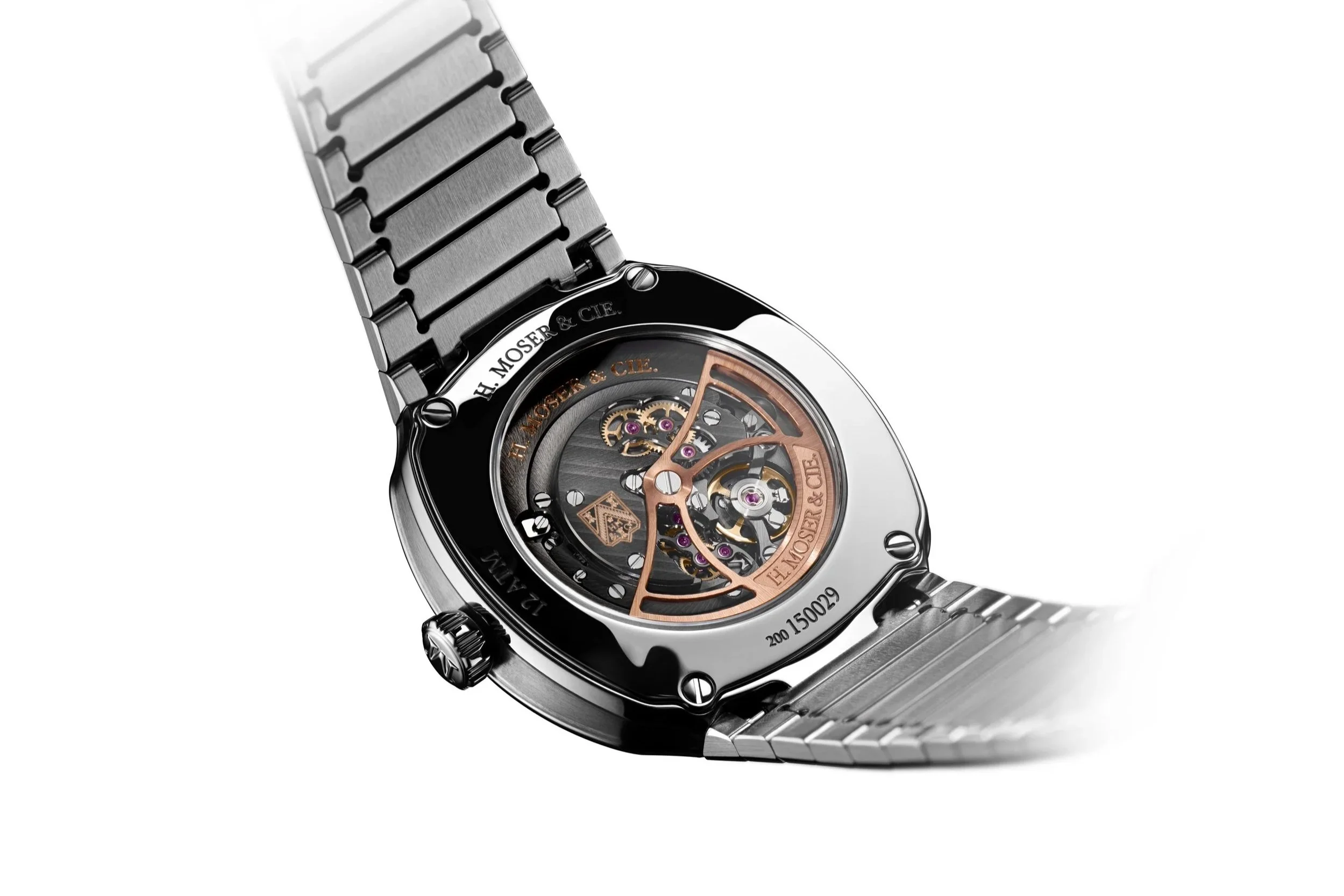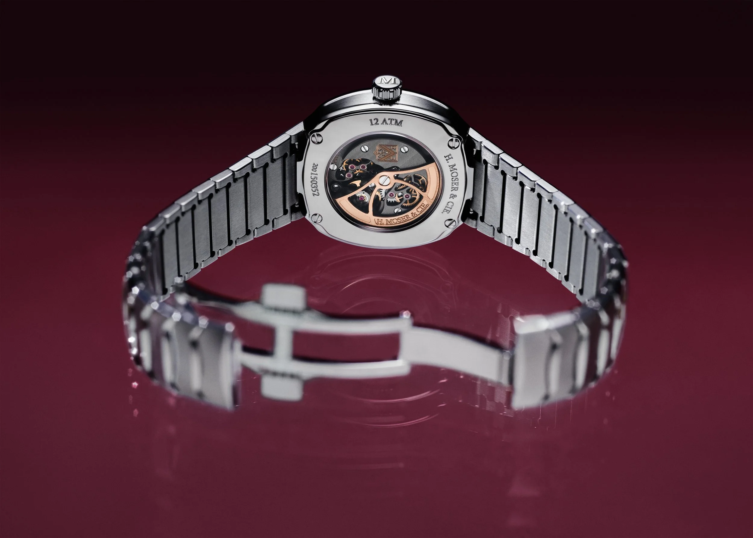 The cases retain the familiar Streamliner shape with the rounded, fluid feel that flows directly into the integrated bracelet. What’s changed is the scale of everything. Making something smaller is easy, but retaining the right proportions is the hard part. If Moser had just halved the dimensions on all the components, it would be a good miniature but a terrible watch for the wearer. The bracelet has been reworked link by link to maintain proportions and comfort. On the wrist, that matters more than the diameter alone.