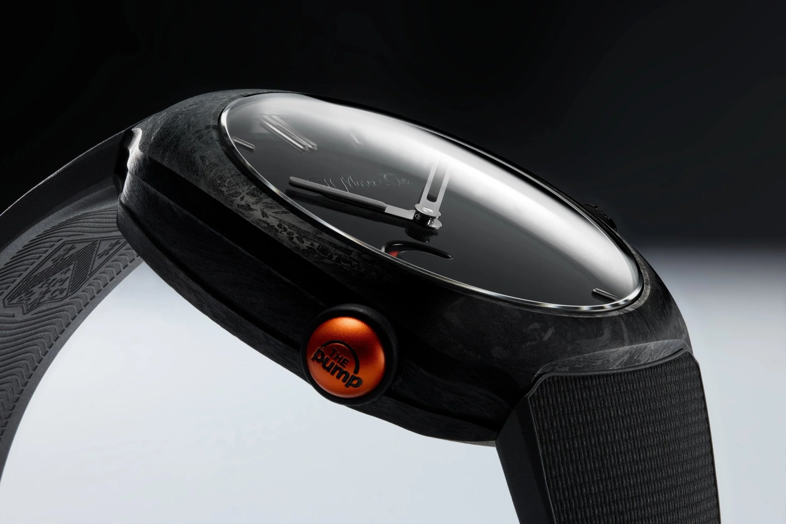 The defining feature of this watch has to be the winding system. Instead of turning a crown like you would on most other watches, here, you press an orange pusher integrated into the case. Each press transfers energy directly to the mainspring, and one press gives you more than an hour of power reserve. Where has this wonderful mechanism comes from? Straight from the original sneaker with its integrated pump. With this system, winding becomes a compeltely different tactile experience that is downright playful.
