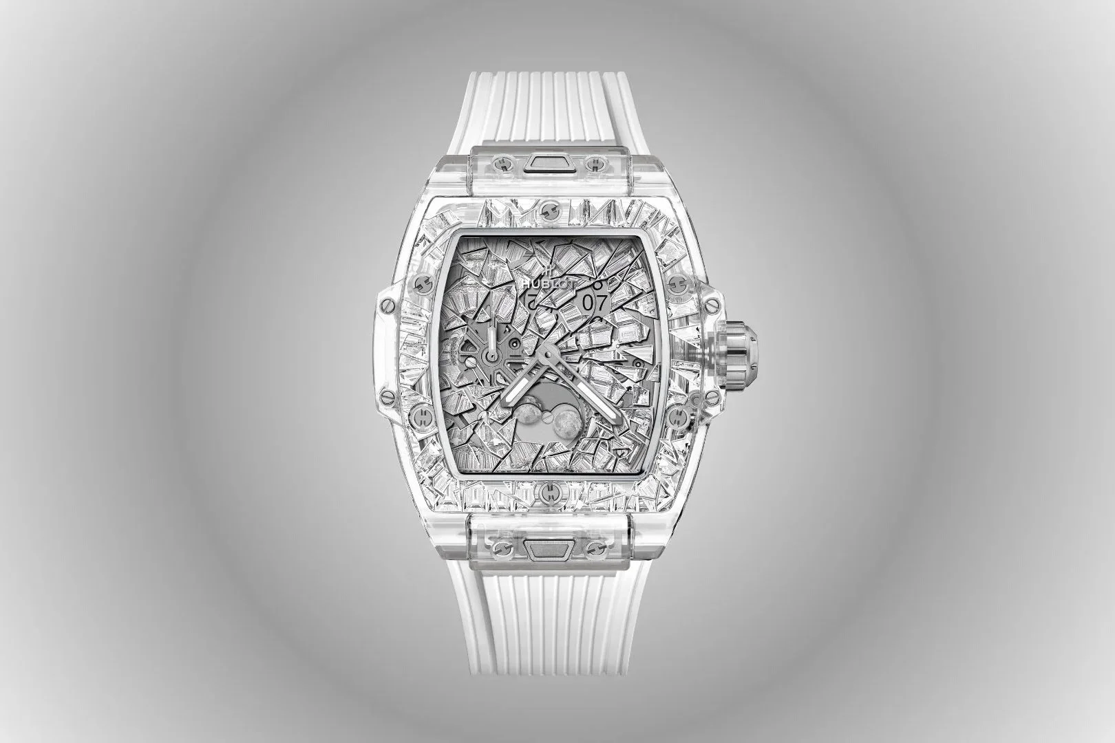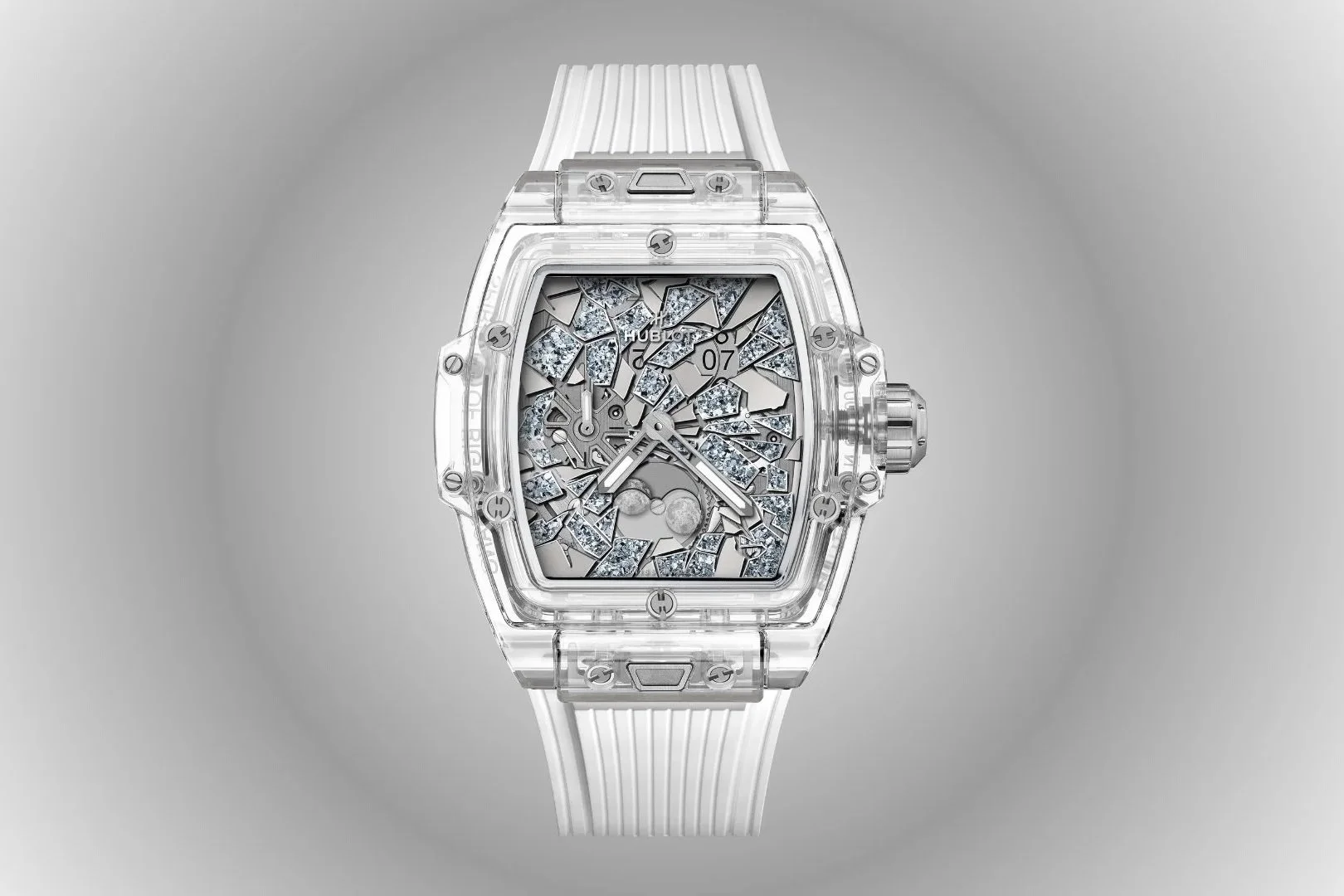 On the diamond-set version, you’re looking at 145 fancy-cut diamonds spread across the case, bezel, and dial. But what matters more is how they’re arranged. The “Impact” motif isn’t random. It’s a radial fragmentation pattern, with shards extending outward from the center of the dial, intersecting with the moonphase display at 6 o’clock.