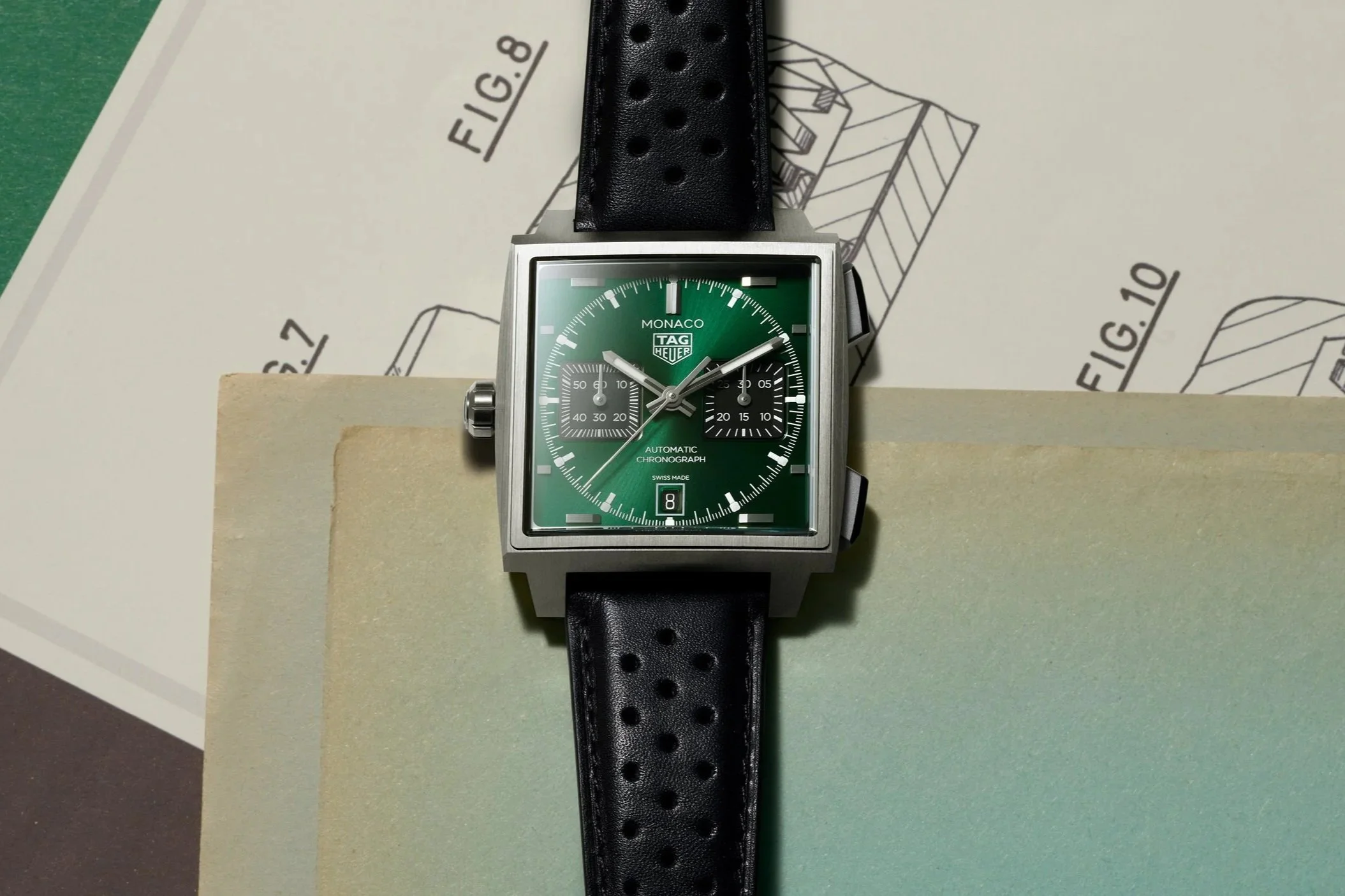 The dial stays true to the Monaco layout, but it’s been cleaned up. It is largely the same configuration that we have come to know and grow fond. Why change a winning team ? Each colorway has its own personality. The blue version is a direct and deliberate nod to the McQueen-era Monaco, with red accents that keep it feeling sporty. Yes, the one that we all think of when we think about Tag Heuer. The green dialleans more modern, with a sunray finish that plays with light but doesn’t get distracting. And the black opaline dial in the two-tone model is probably the most restrained of the three, giving off a clean, slightly dressier, and arguably more versatile feel.