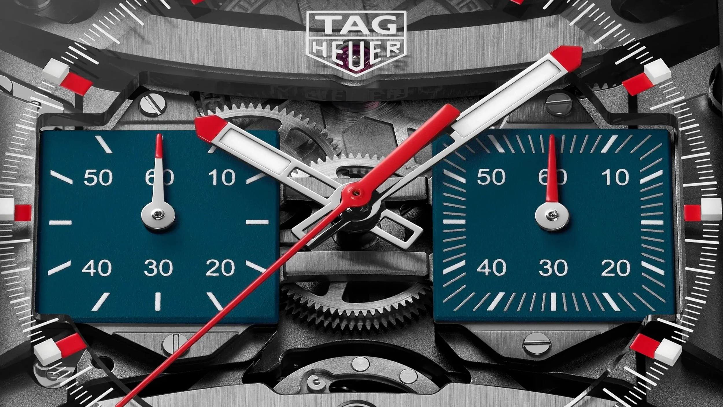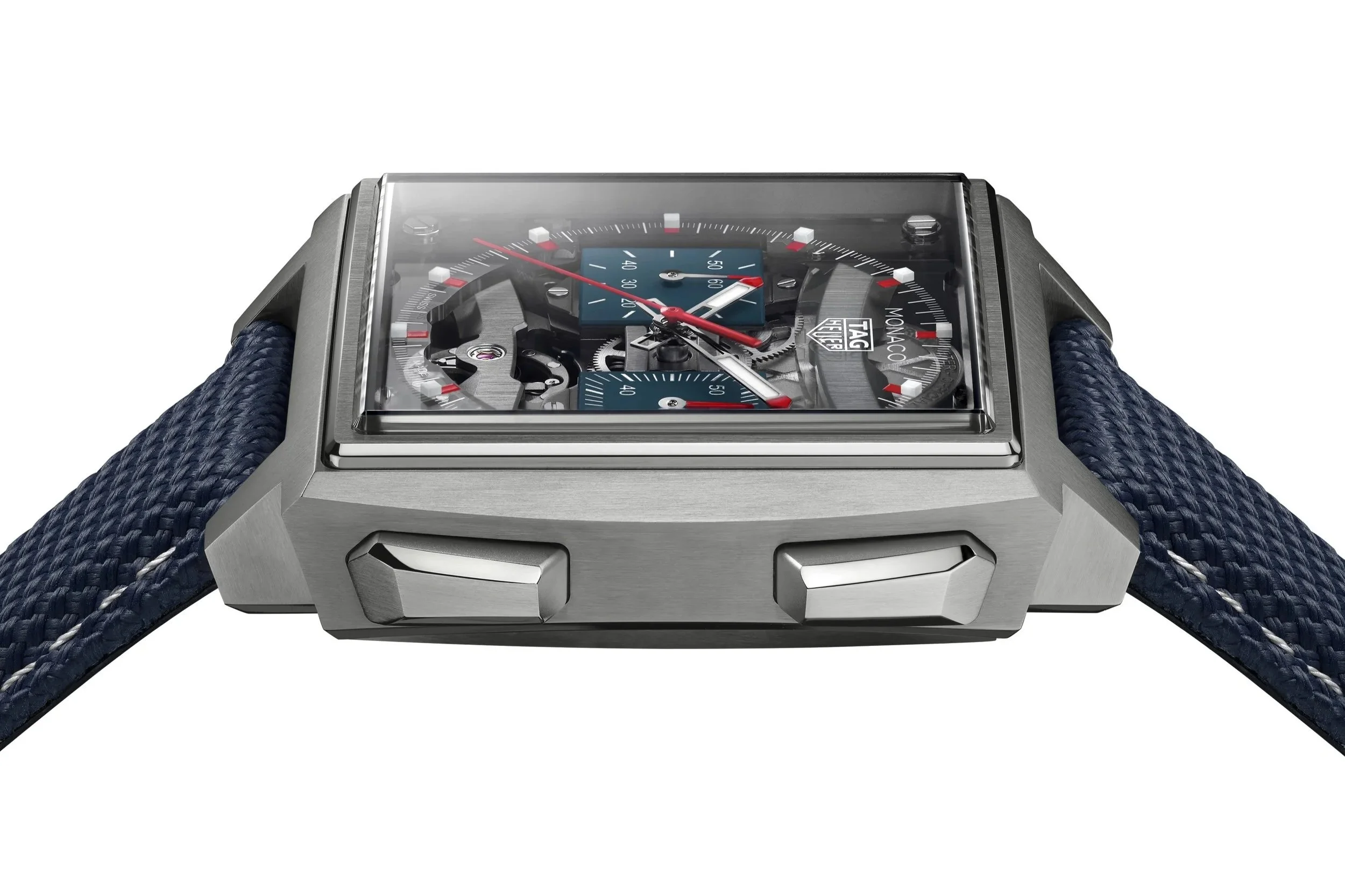 The case has also been reworked. At 40mm in grade 5 titanium, it keeps the Monaco’s recognizable square profile but introduces more curvature and tapering. The result is a watch that looks less blocky and sits better on the wrist. The caseback mirrors this approach, with a shape that follows the wrist more naturally. Visually, there are two directions you can take with this piece. The natural titanium version with blue accents leans into the classic Monaco aesthetic: the perfect balance between innovation and heritage. The black DLC version with red accents pushes harder into the cutting-edge, racing side of things: definitely one for the hardcore fans.